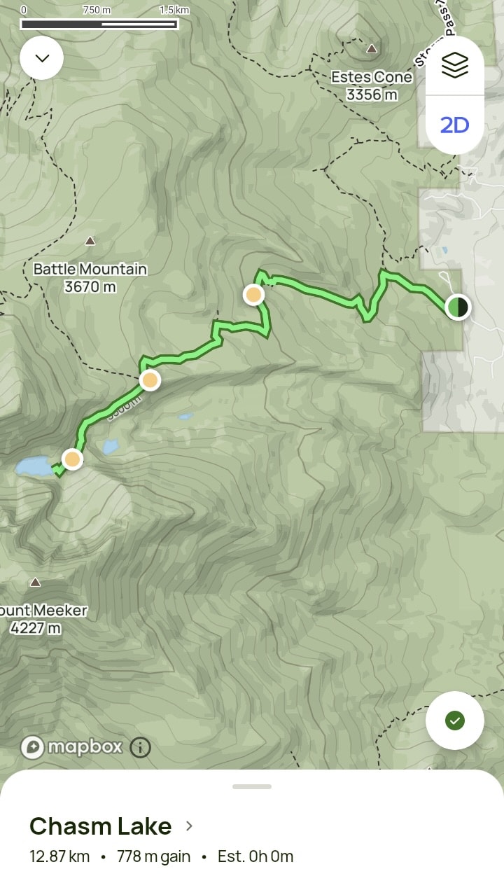 THE BASICS: The hike to Chasm Lake is an out-and-back hike that stretches out to about 8 miles (12.87 km) and with a total elevation gain of 2,552 ft (778 m).